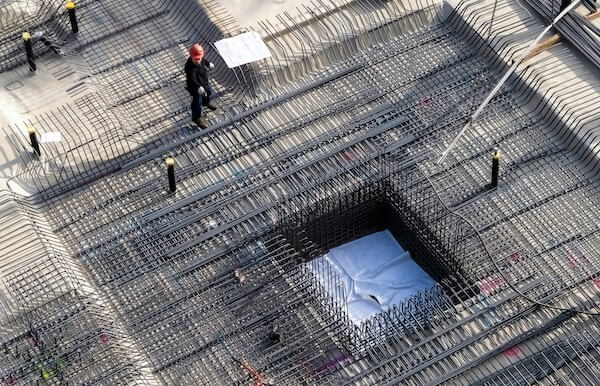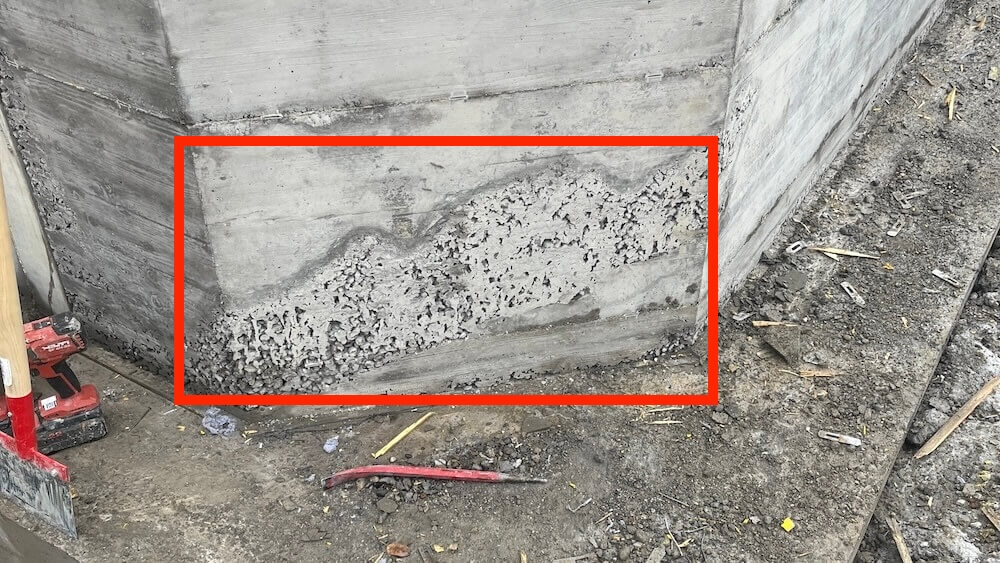 Massive structural defect in the concrete at the wall base (corner area). The fine mortar matrix has failed to encapsulate the coarse aggregate. This indicates insufficient compaction (vibration) or significant formwork leakage (grout loss) at the base. The required concrete cover for the reinforcement is not guaranteed here, creating corrosion risks and severely compromising the watertightness of the construction joint.