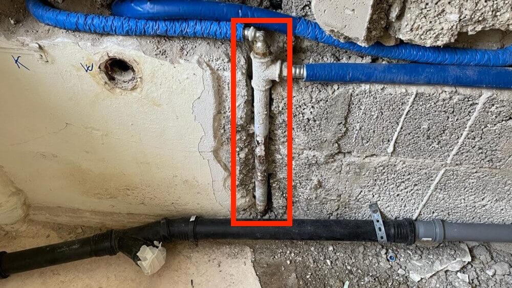 An old, severely corroded vertical metal pipe (presumably galvanized steel) was left inside the wall. The new plumbing lines (blue) are routed directly above/against it.
