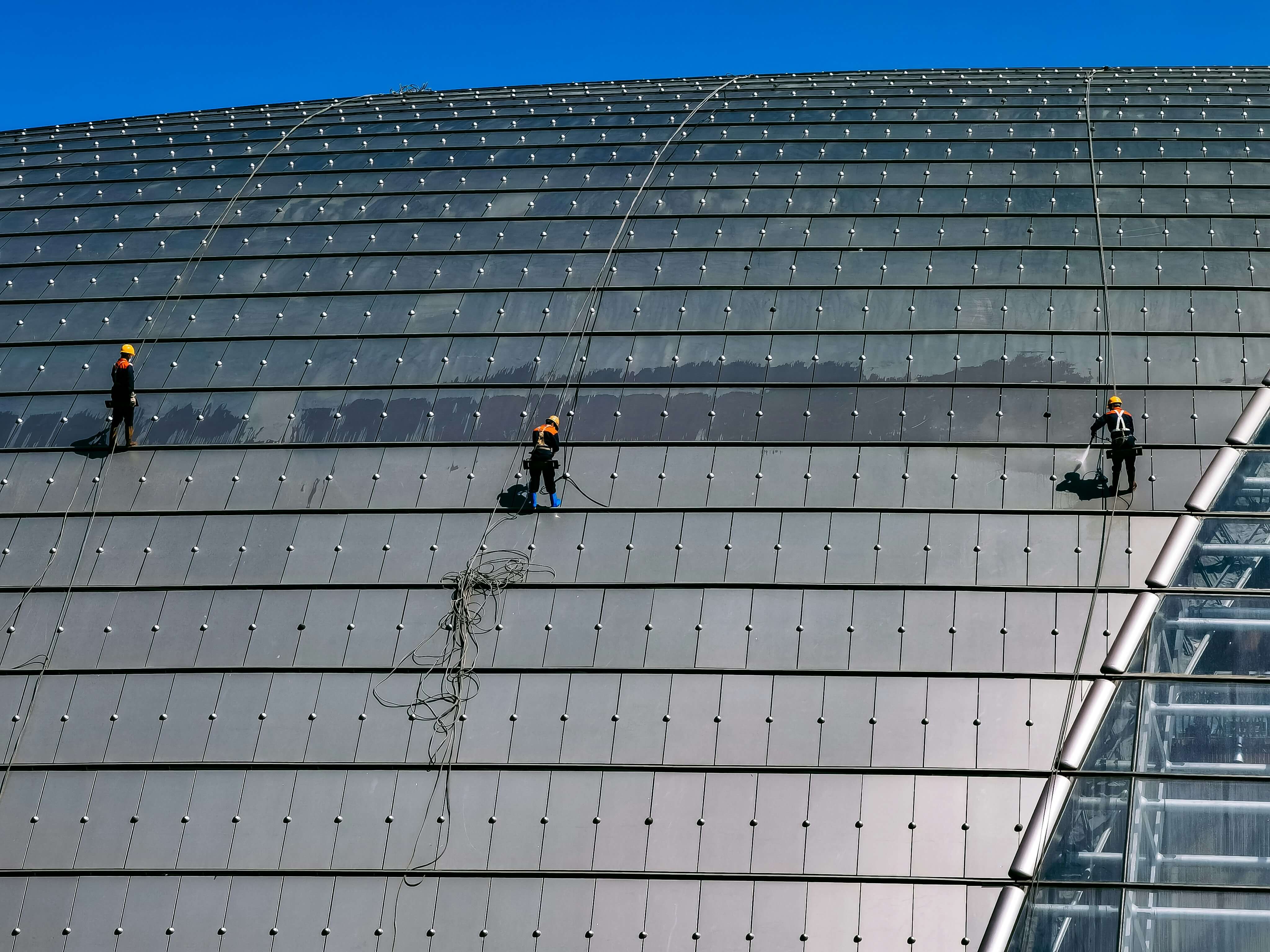 The natural stone paving is installed nearly flush with the bottom edge of the window/door frame. According to SIA 271, a waterproofing upstand height of at least 60mm above the water-bearing layer is required. For barrier-free (threshold-free) transitions, a drainage channel is mandatory immediately in front of the facade to prevent water accumulation and ingress behind the waterproofing connection. Both are missing here. High risk of water damage to the interior and the frame.